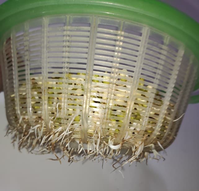 ザルの下側に出た根は包丁で切っても良いし、そのまま食べても問題ありません。