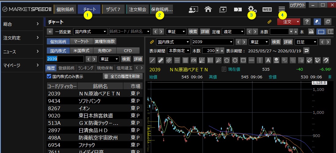 株の売買には楽天証券のMarket Speed 2(以降MS2と略)を使います。
