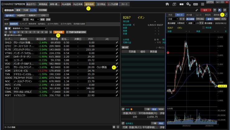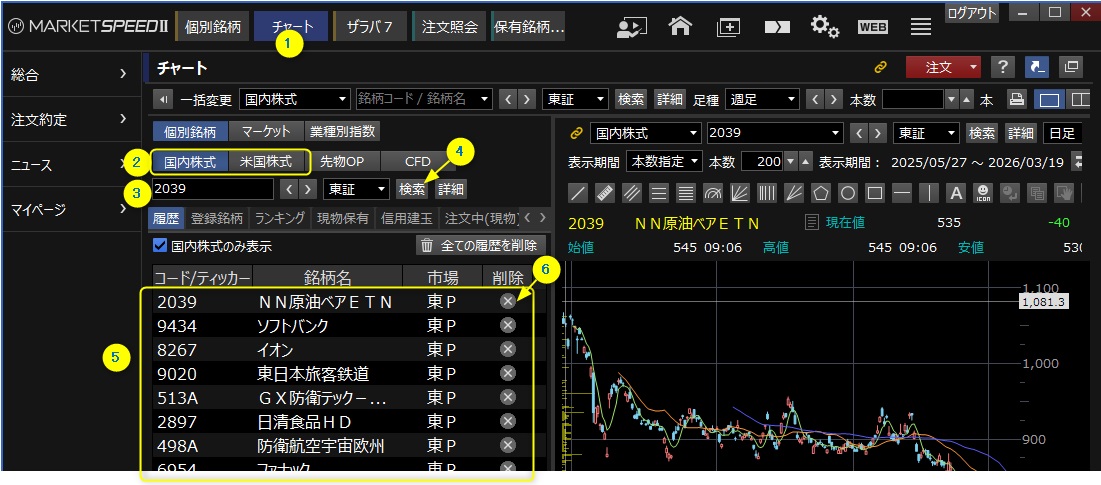 売買前に興味のある銘柄をチャートへ登録しておきます。個別銘柄への登録