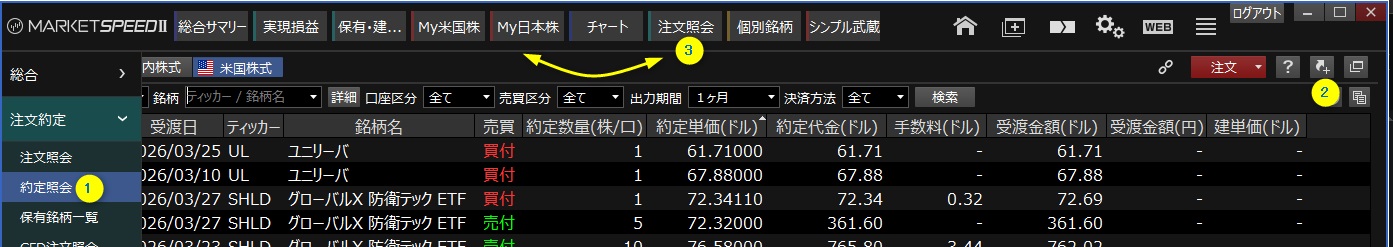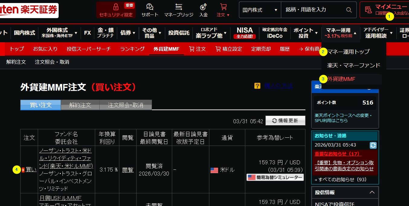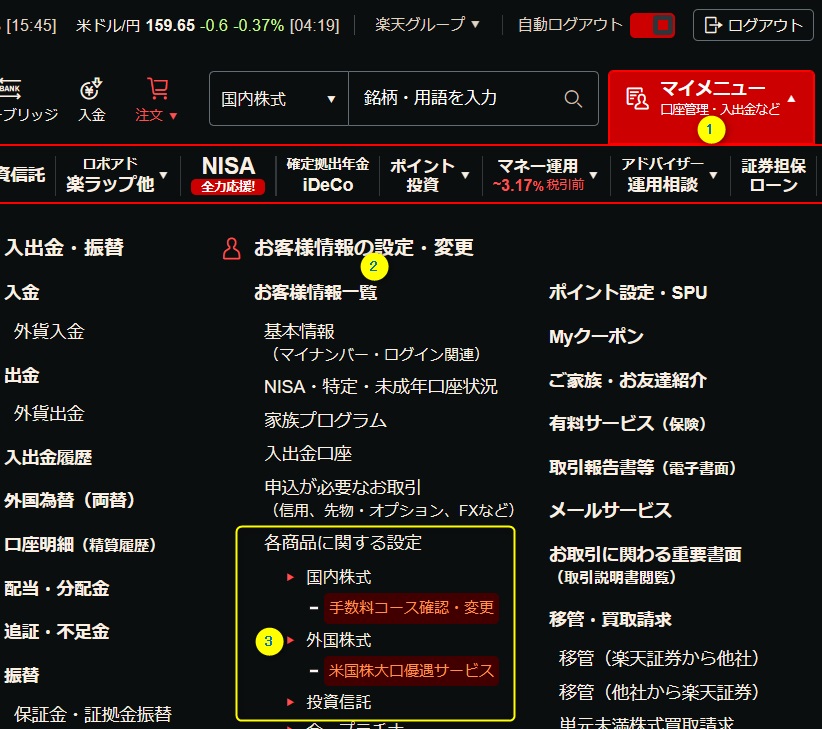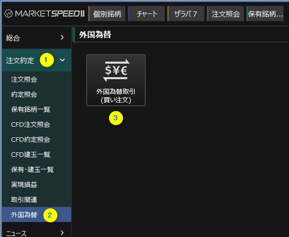MS2の左側メニューから、以下の①②③と操作すると楽天証券の両替サイトにジャンプします。