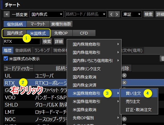 チャートに銘柄を登録したら①国を選んでから、②売買する銘柄名の上で右クリック。