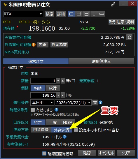 売買で重要なのが「外貨決済」を選ぶこと。