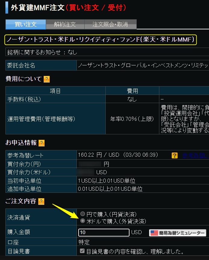 ①ノーザン・トラストMMFの購入時に必ず外貨決済としてください。